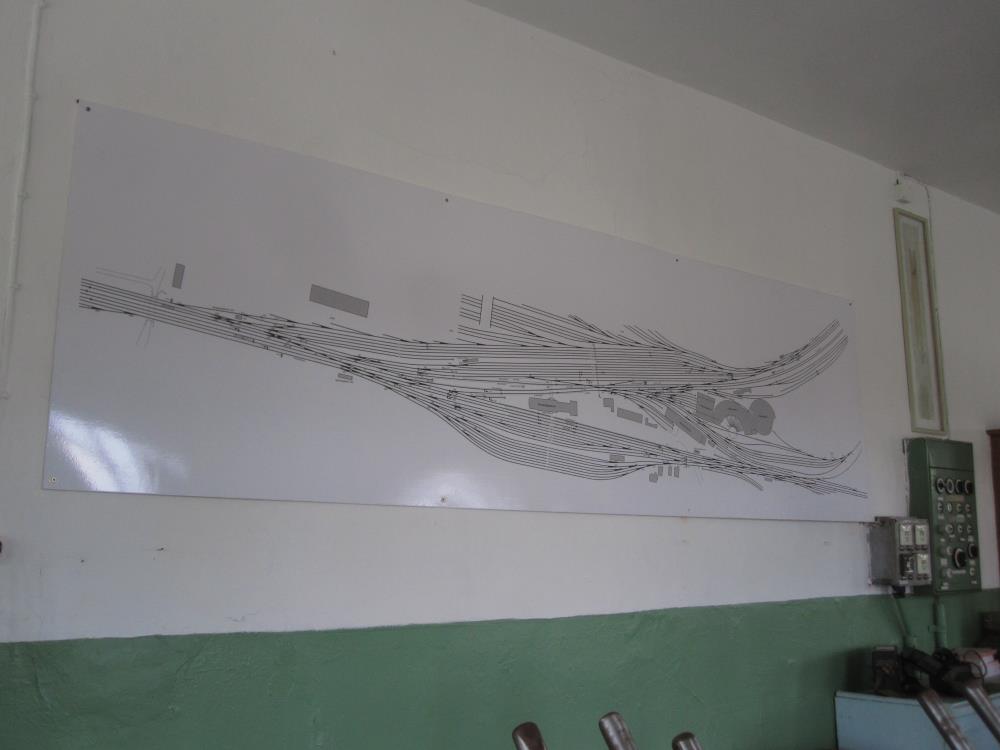 An der Wand über den Stellhebeln befindet sich ein großer Plan, der die Gleisanlagen bis zur Jahrtausendwende skizziert. Jede Linie stellte dabei ein Gleis dar. Die Gleisharfe am unteren Rand der Darstellung nannte man „Magdeburger Bahnhofsseite“, weil hier die Züge von und nach Stendal/Salzwedel/Magdeburg fuhren.