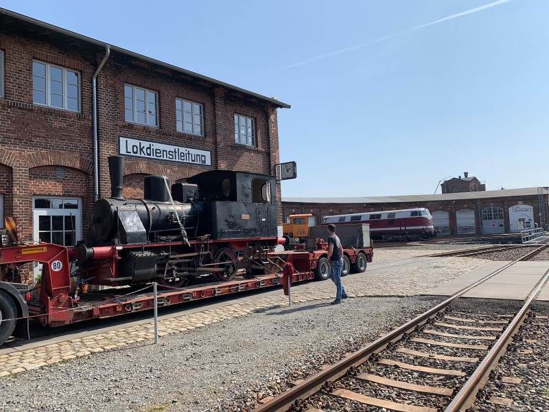 At short notice and rather unexpectedly a new exhibit reached us today, which will probably stay in the museum for some time. It is a small Orenstein & Koppel shunting locomotive, originally constructed for the municipal gas works in Karlsruhe. The locomotive was in service there from 1919 to the mid 1960s. After that, she changed hands several times over the years, one of her resting places being Almstedt-Segeste and finally she came to the South German Railway Museum in Heilbronn, which has now sold the locomotive. The new owner is planning to restore her to full working order