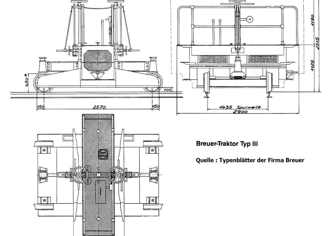 For this reason, the Breuer company in Höchst (now part of Frankfurt/M) developed a very short two-axle vehicle in the 1910s that was powered by a petrol engine. The unique feature of this type of vehicle was that it could drive under the buffer beam of a wagon to be moved and clamp itself there with a mechanical ram. This lifted one side of the wagon by about 20 centimetres, which meant that part of the weight of the wagon was borne by the tractor, which in turn increased its friction weight and prevented its drive wheels from spinning so quickly.