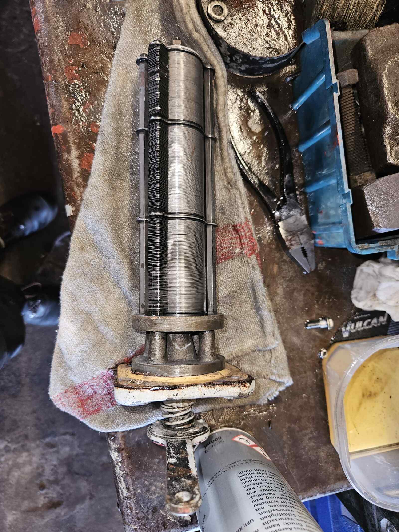 Work was also carried out on our class 114 diesel locomotive. Here, our colleagues cleaned the so-called gap filter. This is a device that filters metallic impurities out of the engine oil. Such a slotted filter consists of several hundred layers of thin metal sheets, between which the engine oil is pressed and which catch the impurities.