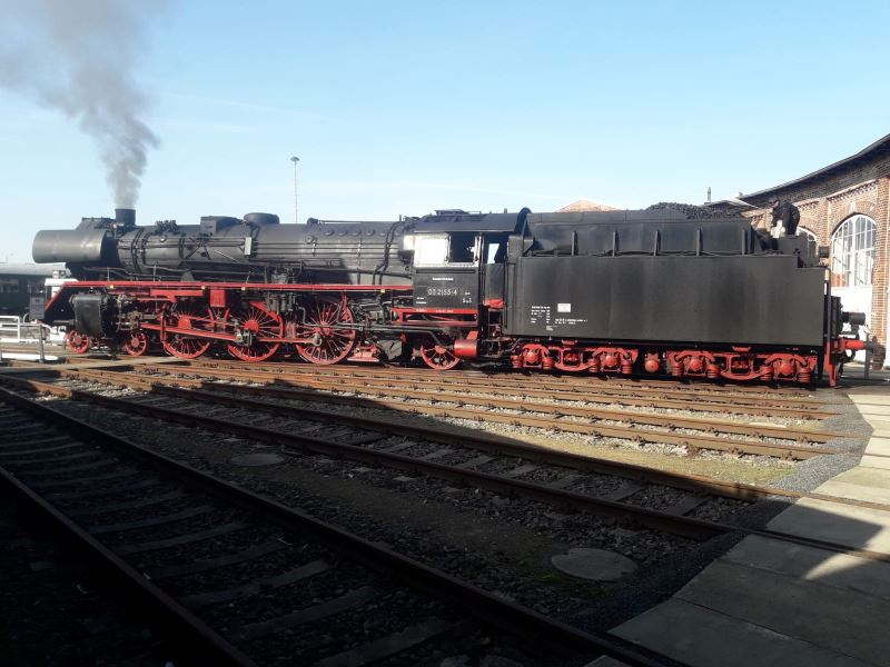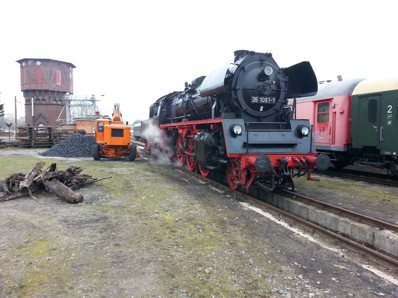 In the past few days, two steam locomotives have visited Wittenberge depot to take on coal and water and to berth some historic passenger coaches here for a few days when they were not in use between working railtours. On Monday, February 25, steam loco 03 2155 of the company WFL came to visit the premises of the historic locoshed to replenish her water supply and some three hours later, left the yard to steam off towards Berlin. She also left three passenger cars of type Bghw stabled here, which were to work a special train on March 2 from Hamburg to Wernigerode. These carriages were collected on March 1 by 35 1097 and our colleagues from Glauchau, and the empty coaches to Hamburg were piloted by diesel loco 118 770.