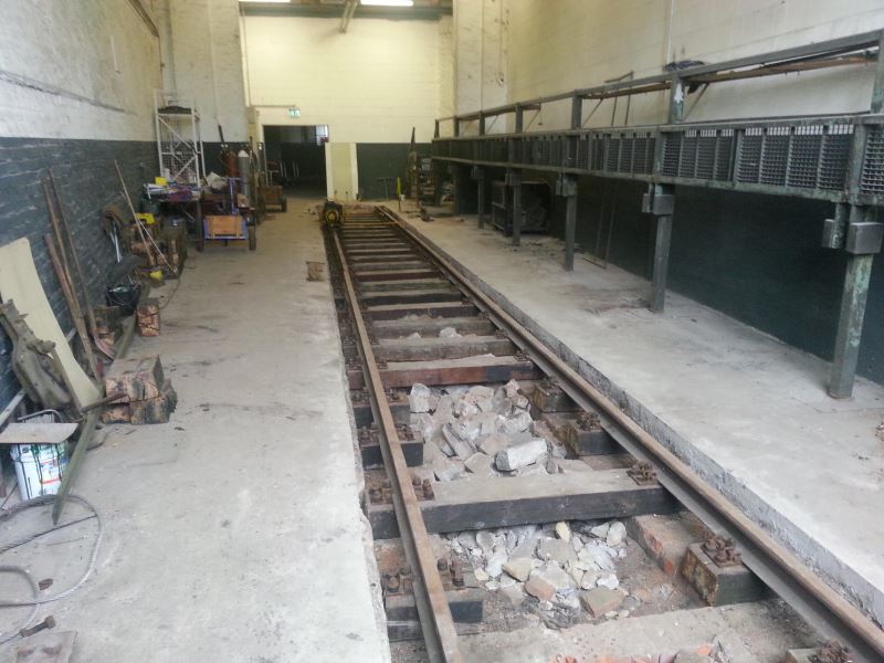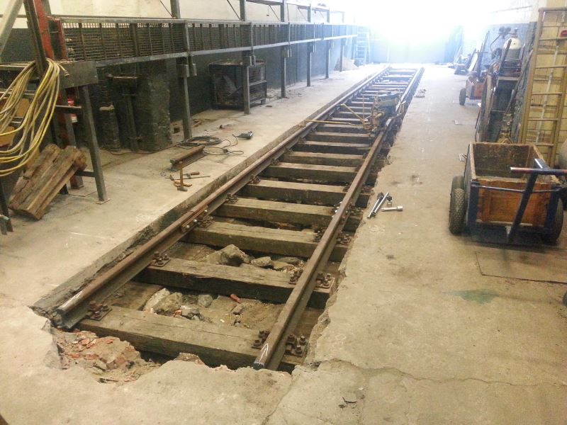 Work on the track in the locoshed itself is also making good progress. In the meantime, sleepers and rails have been laid. Now the more important jobs still remaining are concreting the space between the rails and those between the outside of the rails and the existing floor.