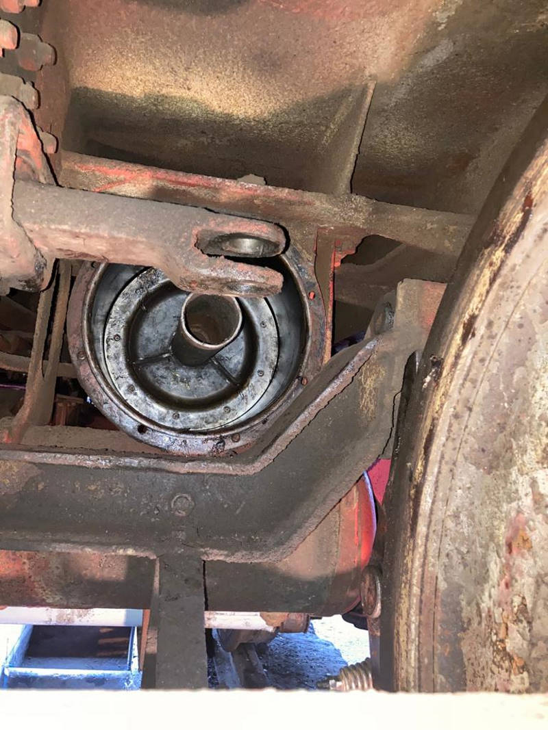 In the following picture you can see the brake piston installed in the brake cylinder. The piston rod is still missing, which is inserted into the thin tube and connected to the fork in the foreground. By the way, the round disc on the right side of the picture is the inside of a wheel of the tender.