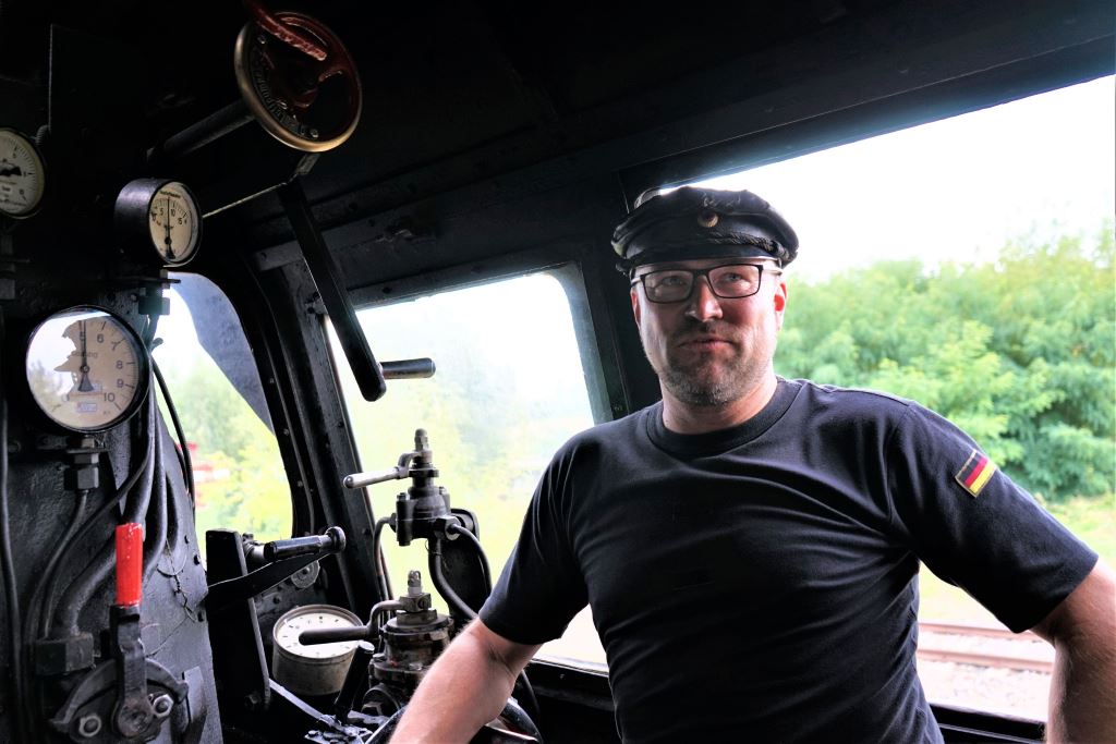 Dennis Kathke fuhr Besucher im Führerstand einer Dampflok der Baureihe 50 über das Gelände. Foto: Alexander Rekow |