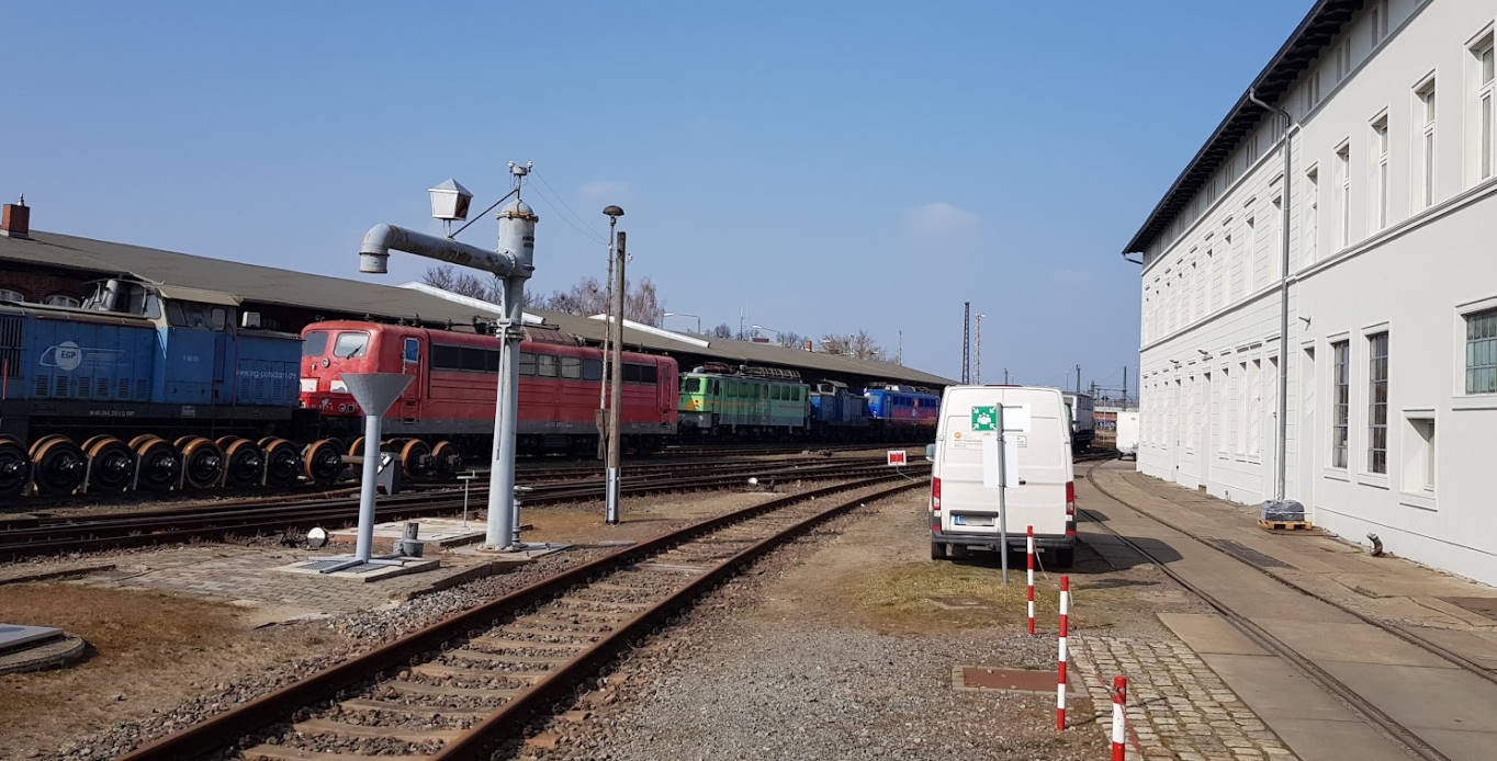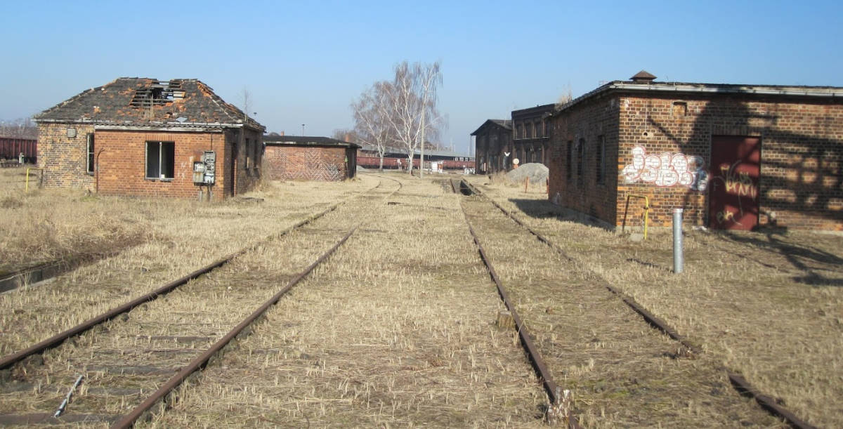 View of the former Magdeburg side of the station. This is where the trains went to and from the south until 1999. Today, our driver's cab rides take place here. A track-laying machine is also on display. The wasteland next to it has recently been revitalised by a road and a shopping centre.