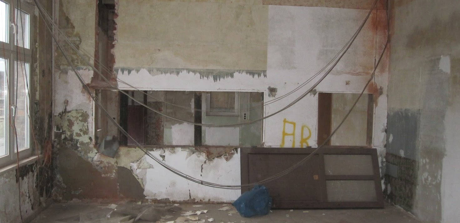 View into the interior of the former dispatcher room. In front of the partition wall sat the dispatchers, who distributed the daily tasks to the locomotive crews through the still recognisable window in the wall. The partition wall was removed and the reception area of the museum was created.