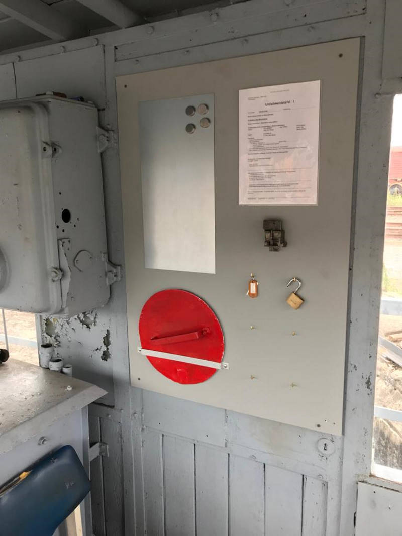 Denjenigen, die sich die Drehscheibe näher angesehen haben, ist vielleicht aufgefallen, dass im Bedienhaus, von dem aus die Drehscheibe gesteuert wird, mehr Ordnung herrscht. Hier wurde eine Aufbewahrungstafel für verschiedene Accessoires, wie Schlüssel und Signalmittel, angebracht.