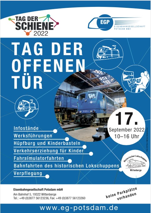 Am kommenden Samstag, den 17.09.2022, dem landesweiten Tag der Schiene 2022, veranstalten unsere Nachbarn, die Eisenbahngesellschaft Potsdam, einen Tag der offenen Tür in ihrer Werkstatt in Wittenberge. Besucher sind zwischen 10 und 16 Uhr herzlich eingeladen, die Firma und den Lokschuppen III im Wittenberge zu besuchen und sich über die Arbeit der EGP zu informieren. Natürlich ist auch unser Museum im Historischen Lokschuppen II geöffnet und wir bieten Fahrten im Gelände mit einem kleinen Museumszug an.