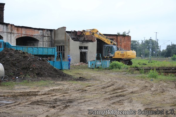 Inzwischen haben die Bauarbeiten im Bereich der Lokschuppen II und III des ehemaligen Bw Wittenberge begonnen: