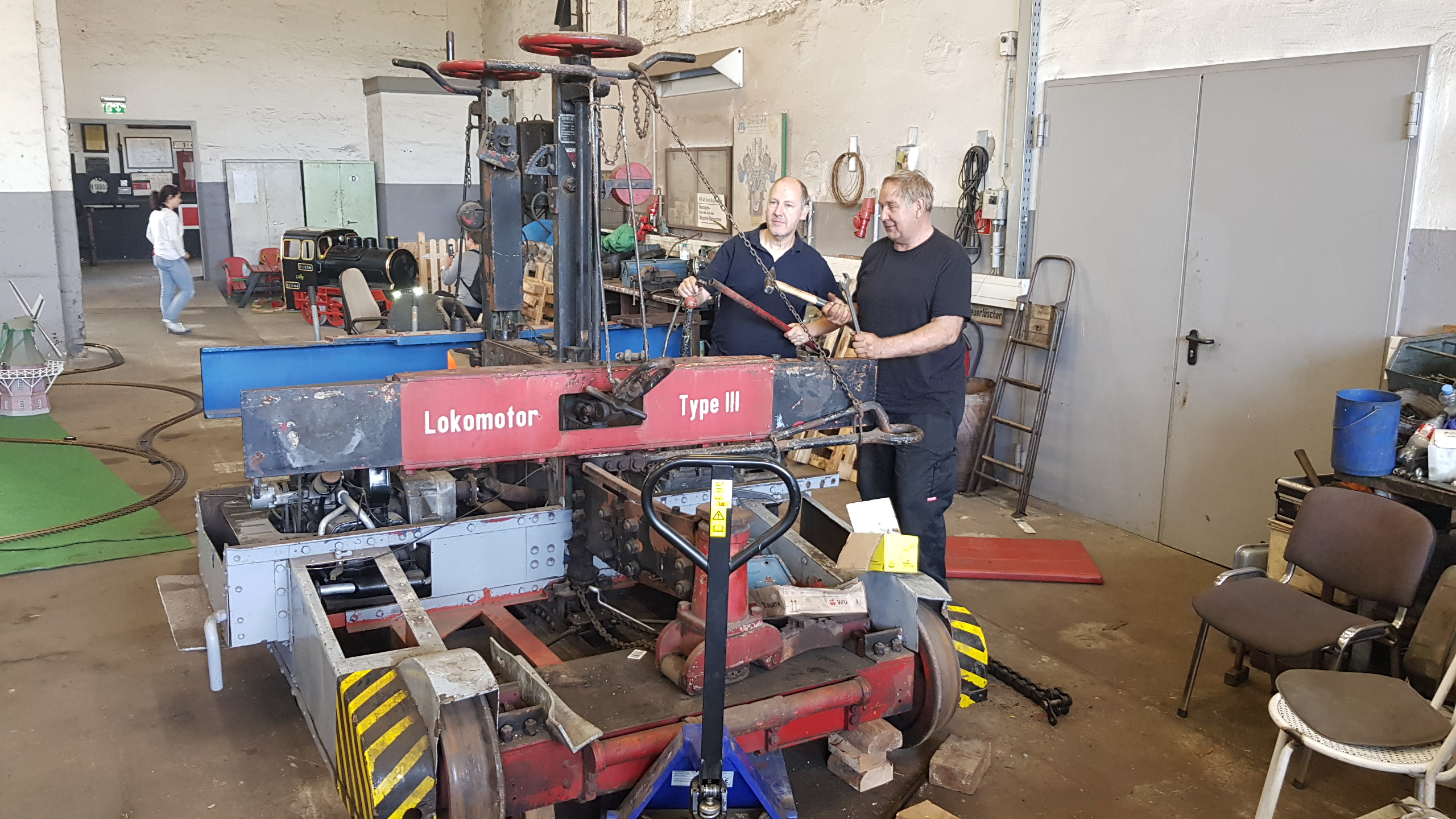Our shunting tractor belongs to type III, which was equipped with a 40 hp engine. It was delivered to Maschinenfabrik Heller in Nürtingen in 1939. At some point, it was fitted with a VW Type 122 engine, which car enthusiasts will recognise in a similar form from the VW Beetle. In 1984, it came to the Friends of the Hamburg Railway Association and was exhibited in the Hamburg-Wilhelmsburg Railway Museum. It was also shown at the exhibition "150 years of the German railway" in Bochum Dahlhausen.