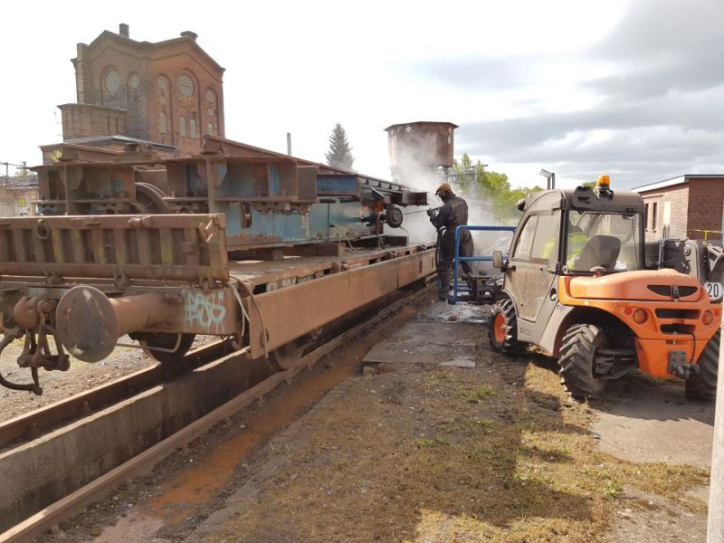 An anderer Stelle berichteten wir bereits darüber, dass die Drehscheibe im Bereich des ehemaligen Lokschuppens 1 Ende der 1990er Jahre verschrottet und die Drehscheibengrube verfüllt wurde. Da es es das langfristige Ziel des Vereins ist, diese Anlage wieder auferstehen zu lassen, wurden inzwischen erste Schritte für die Wiedererrichtung unternommen. So konnte aus Parchim eine Drehscheibenbrücke erworben werden, die in die wieder zu erschließende Drehscheibengrube des Lokschuppens 1 eingebaut werden kann. Sie hat die passende Länge. Nun wurden die Brückenteile von einer Fachfirma mittels Hochdruck-Wasserstrahl von alter Farbe und Rost befreit und anschließend grundiert. Nun können die Teile befundet werden. Wir erwarten dabei keine größeren Schwierigkeiten. Die Bilder zeigen die Reinigungsarbeiten am 23.5.2017.