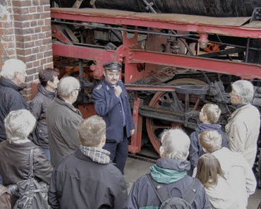 Geschichten von "Kosakenkies" und "Afrikas Rache": Dirk Endisch (M.) führt eine Besuchergruppe durch die Ausstellung und erzählt Anekdoten aus der Eisenbahnervergangenheit.